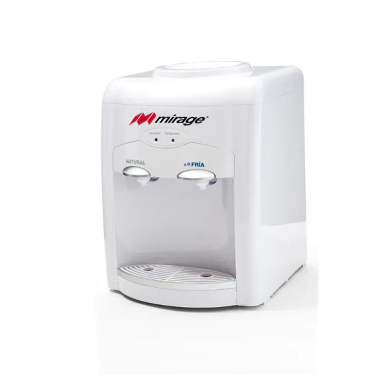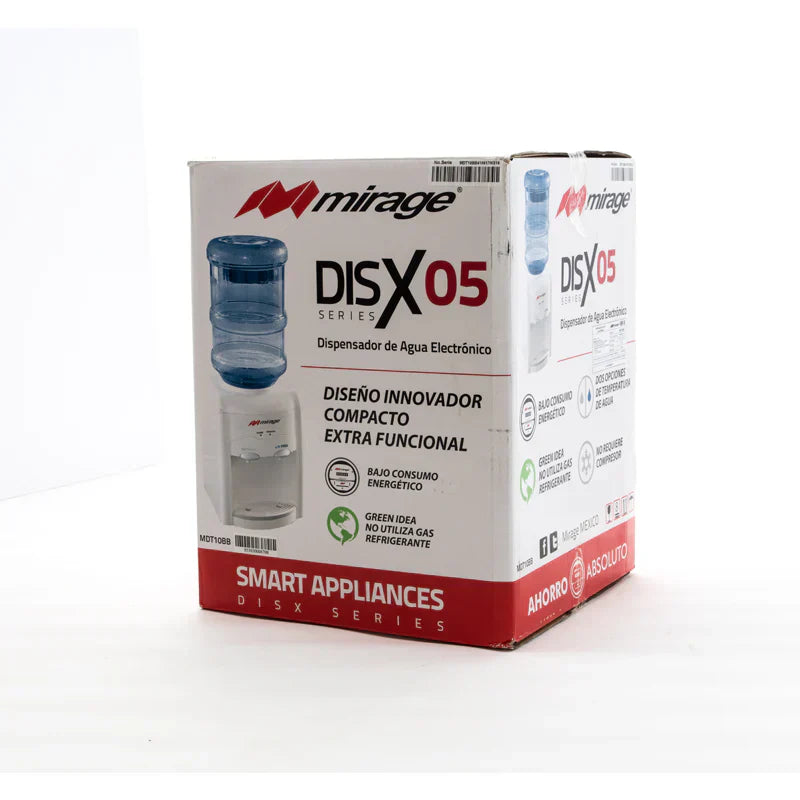El Mirage DISX05 MDT10BB es un dispensador de agua tipo Table Top (sobremesa), compacto, elegante y funcional, ideal para espacios reducidos como cocinas, oficinas, salas de espera o habitaciones. Su diseño en color blanco con detalles en gris aporta un toque moderno, mientras que su operación con 127 V~ garantiza compatibilidad con cualquier toma estándar en México.