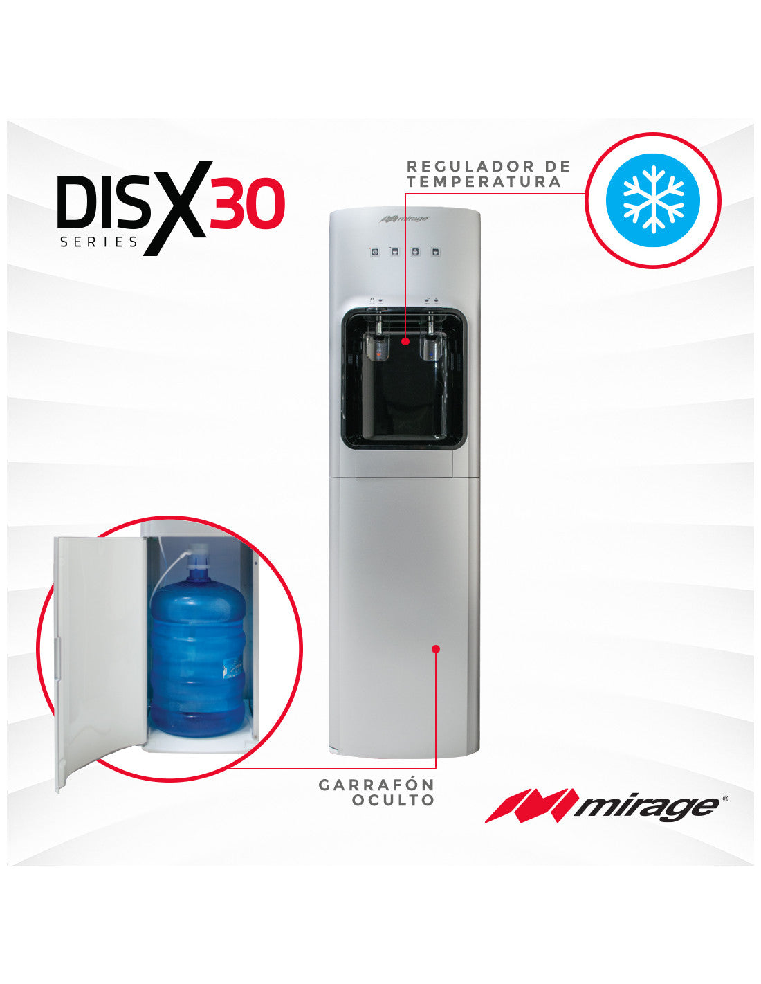 El Mirage DISX30 es un dispensador de agua de carga inferior con sistema de enfriamiento por compresor, diseñado para brindar comodidad, eficiencia y un toque moderno a cualquier hogar, oficina o negocio. Gracias a su tecnología de 3 temperaturas (fría, caliente y ambiente), su fácil recarga inferior y su acabado en acero inoxidable, este modelo destaca por su funcionalidad, durabilidad y diseño elegante.